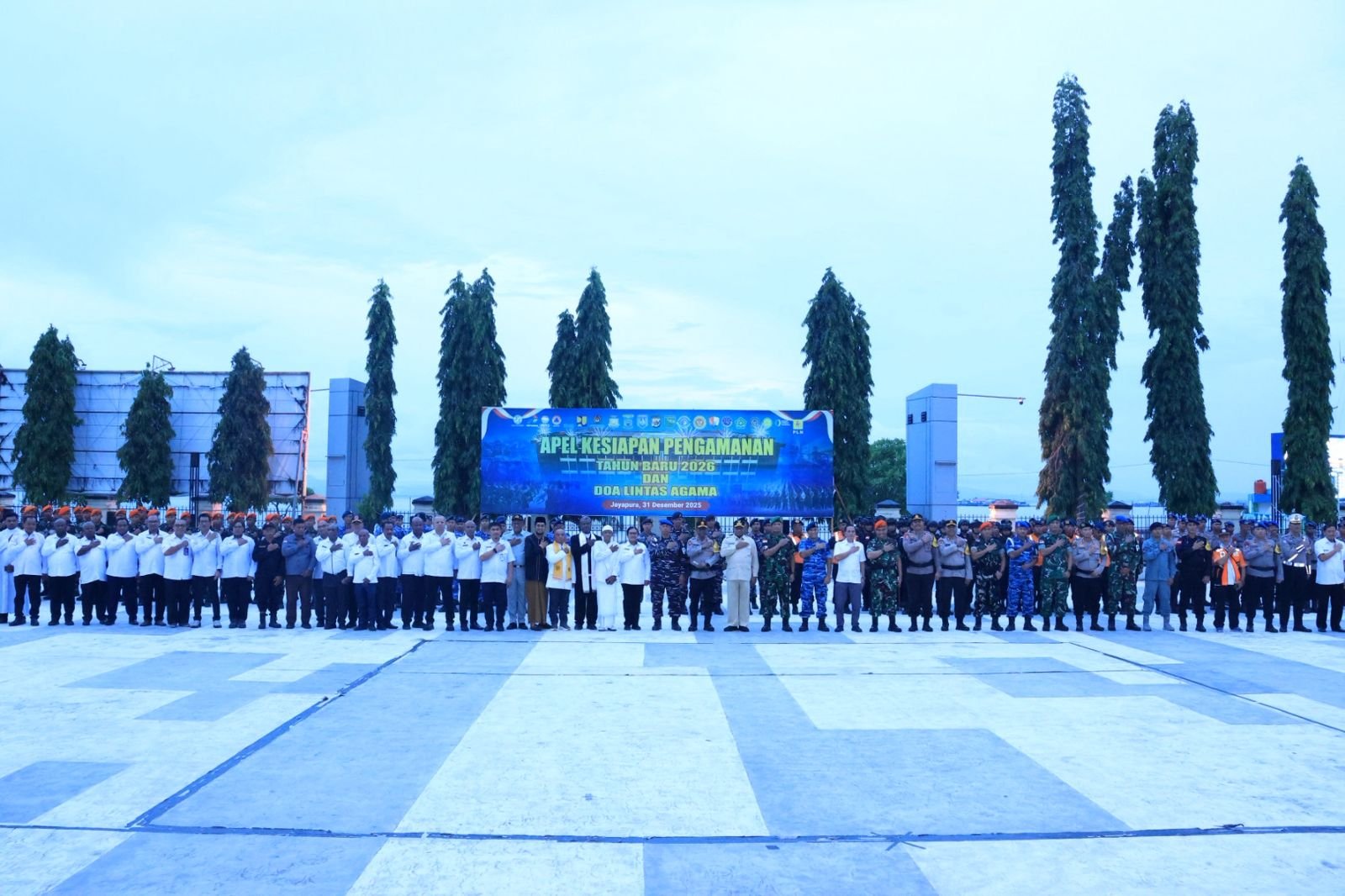 Papua – Polda Papua bersama Pemerintah Provinsi Papua dan unsur Forkopimda menggelar Apel Gabungan Kesiapan Pengamanan Tahun Baru 2026 yang dirangkaikan dengan Doa Lintas Agama, di Halaman Kantor Gubernur Papua, Rabu (31/12/2025) sore.