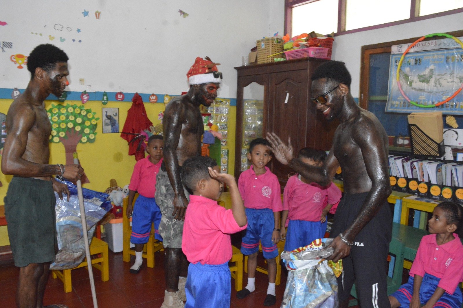 Papua – Dalam rangka menyambut Natal 2025 dan Tahun Baru 2026, Bhayangkari bersama Satuan Pelayanan Pemenuhan Gizi (SPPG) Polda Papua melaksanakan kegiatan berbagi Makanan Bergizi (MBG) dan bingkisan Natal bagi anak-anak di sejumlah sekolah di Kota Jayapura. Suasana sukacita semakin terasa dengan kehadiran Santa Claus yang ikut serta menyapa dan menghibur para siswa.