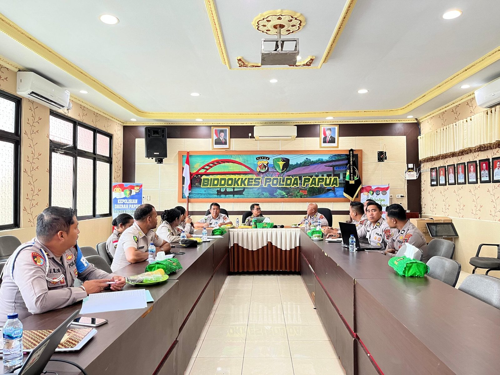 Kegiatan dipimpin oleh Kabid Dokkes Polda Papua, Kombes Pol. dr. Bambang Pitoyo Nugroho, Sp.S., M.H., QHIA, dan dihadiri Pejabat Utama Biddokkes, Biro SDM, Itwasda, Propam, serta perwakilan Rumkit Bhayangkara dan personel terkait.