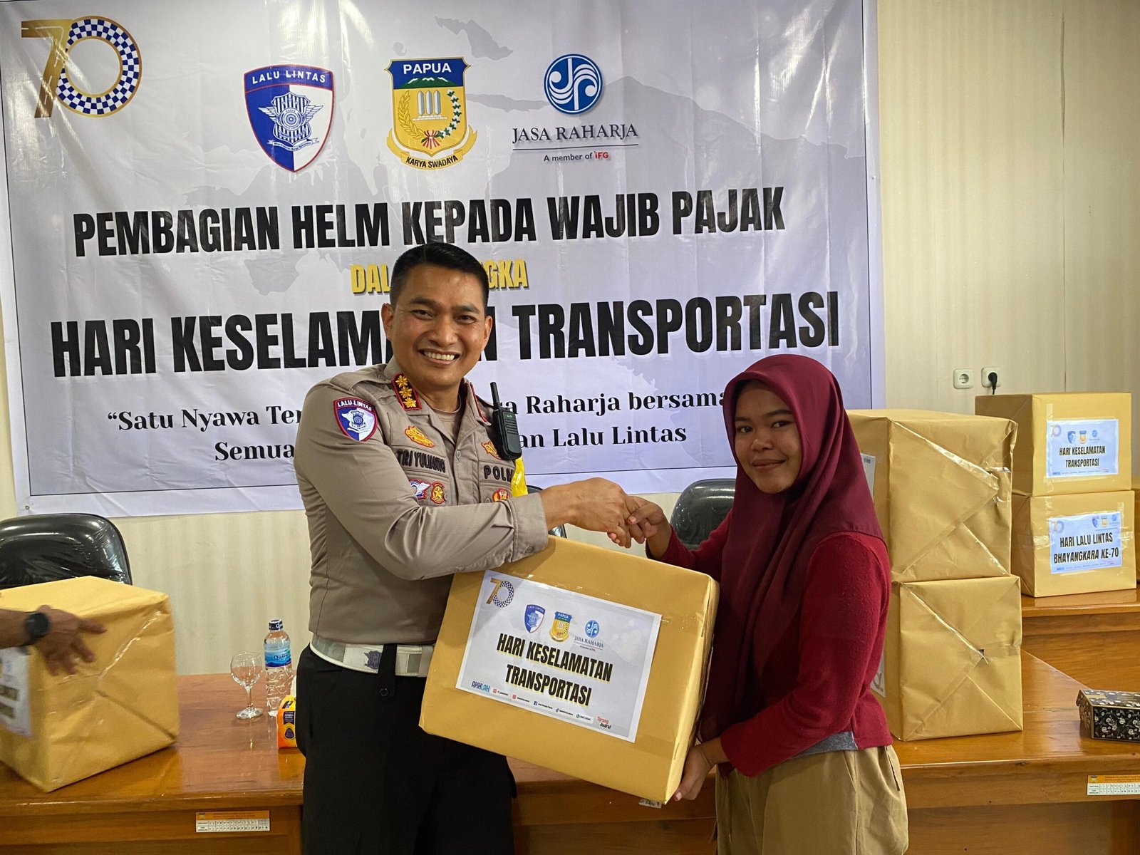 Papua – Direktorat Lalu Lintas (Ditlantas) Polda Papua bersama Kantor Wilayah Jasa Raharja dan Badan Pendapatan Daerah (Bapenda) Provinsi Papua melaksanakan kegiatan pembagian helm kepada peserta wajib pajak dalam rangka memperingati Hari Keselamatan Transportasi. Kegiatan berlangsung di Kantor Samsat, Jalan Raya Abepura, Kotaraja, Hedam, Distrik Abepura, Kota Jayapura, Jumat (19/9/2025).