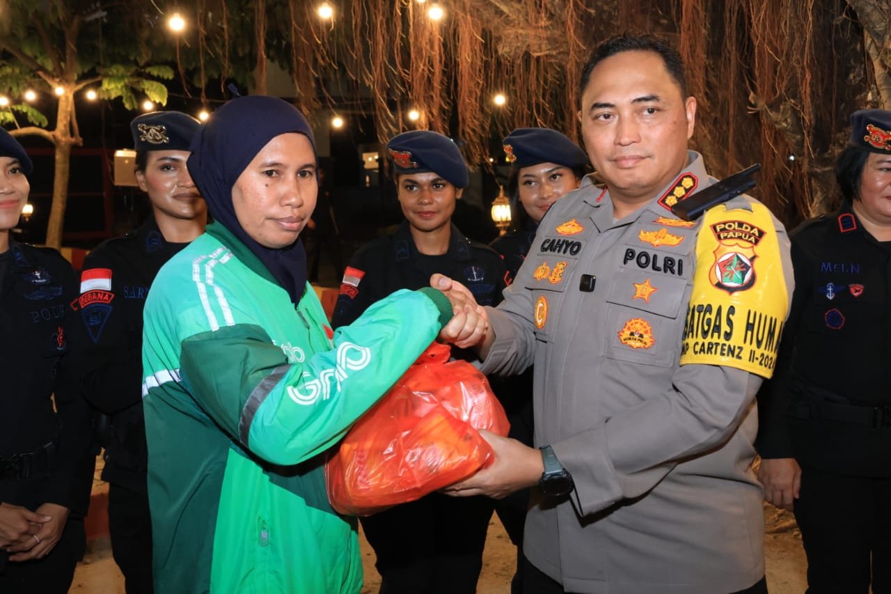 Acara kemudian dilanjutkan dengan penyerahan tali asih secara simbolis oleh Dansat Brimob dan Kabid Humas Polda Papua kepada perwakilan komunitas ojol. Adapun bantuan yang diberikan berupa 500 paket sembako berisi beras, gula, minyak goreng, kopi, dan teh.