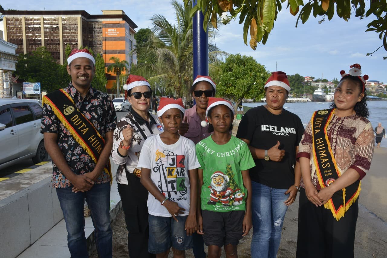 Papua – Menyambut perayaan Natal 2025 dan Tahun Baru 2026, Duta Humas Polda Papua melaksanakan kegiatan berbagi bingkisan berupa aksesori dan pernak-pernik Natal kepada masyarakat di Kota Jayapura pada Kamis (11/12/25).