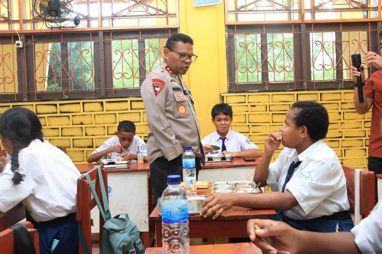 Papua – Kapolda Papua Irjen Pol. Patrige R. Renwarin, S.H., M.Si., didampingi Irwasda Polda Papua Kombes Pol. Jeremias Rontini, S.I.K., bersama jajaran Polda Papua meninjau secara langsung pelaksanaan Program Makan Bergizi Gratis (MBG) di sejumlah sekolah di wilayah Kecamatan Jayapura Utara, Kabupaten Jayapura, pada Senin (29/9/2025).