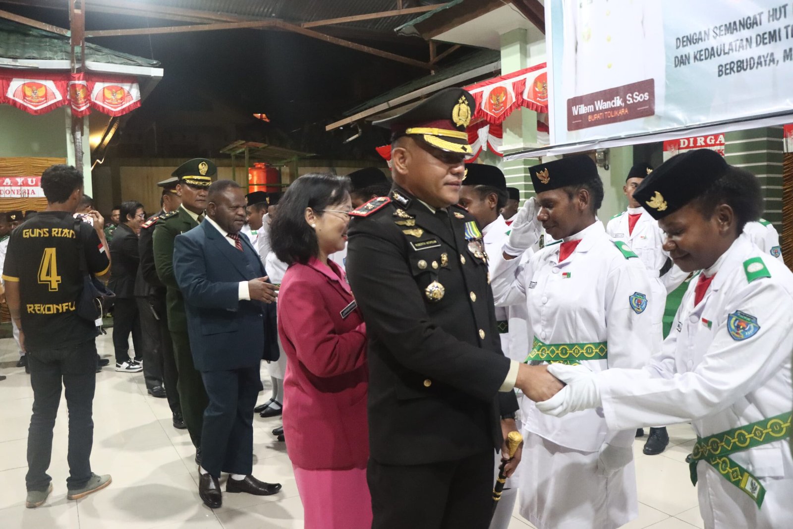 Papua – Menyambut peringatan Hari Ulang Tahun Kemerdekaan Republik Indonesia ke-80, Pemerintah Kabupaten Tolikara menggelar Malam Dharma Bakti Paskibraka yang dipimpin langsung oleh Bupati Tolikara Willem Wandik, S.Sos, bertempat di Makodim 1716/Tolikara, Sabtu (16/08/2025).