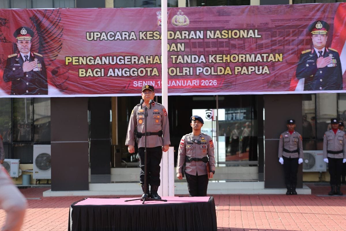 Papua – Wakil Kepala Kepolisian Daerah Papua, Brigjen Pol Dr. Faizal Ramadhani, S.Sos., S.I.K., M.H., memimpin Upacara Kesadaran Nasional yang dirangkaikan dengan penganugerahan Tanda Kehormatan Satyalancana Pengabdian bagi personel Polri di lingkungan Polda Papua, Senin (19/01/26).