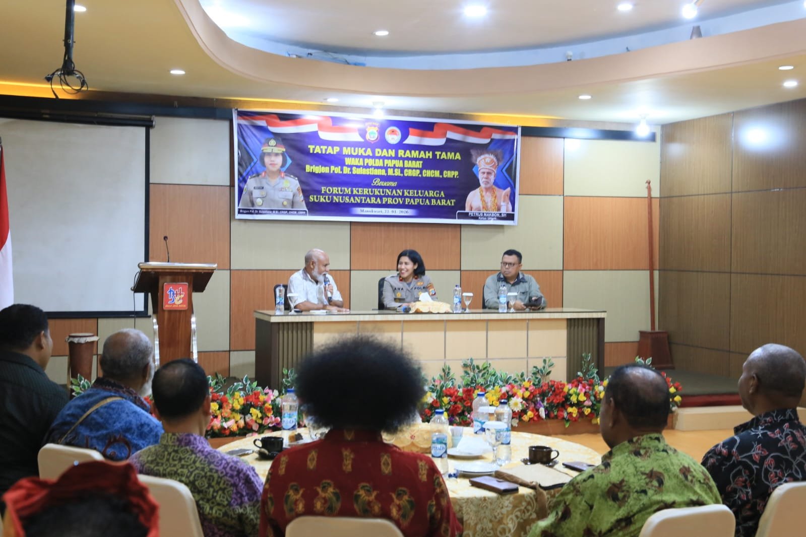 Kegiatan tersebut dipimpin langsung oleh Wakapolda Papua Barat Brigjen Pol. Dr. Sulastiana, M.Si., GRGP., CHCM., CRPP., didampingi Direktur Intelkam Polda Papua Barat Kombes Pol. Sigit Hariyadi, S.I.K., M.H., Direktur Binmas Polda Papua Barat Kombes Pol. Hari S. Sembiring, S.I.K., serta dihadiri oleh para kepala suku dan perwakilan paguyuban suku Nusantara yang berada di wilayah Papua Barat.