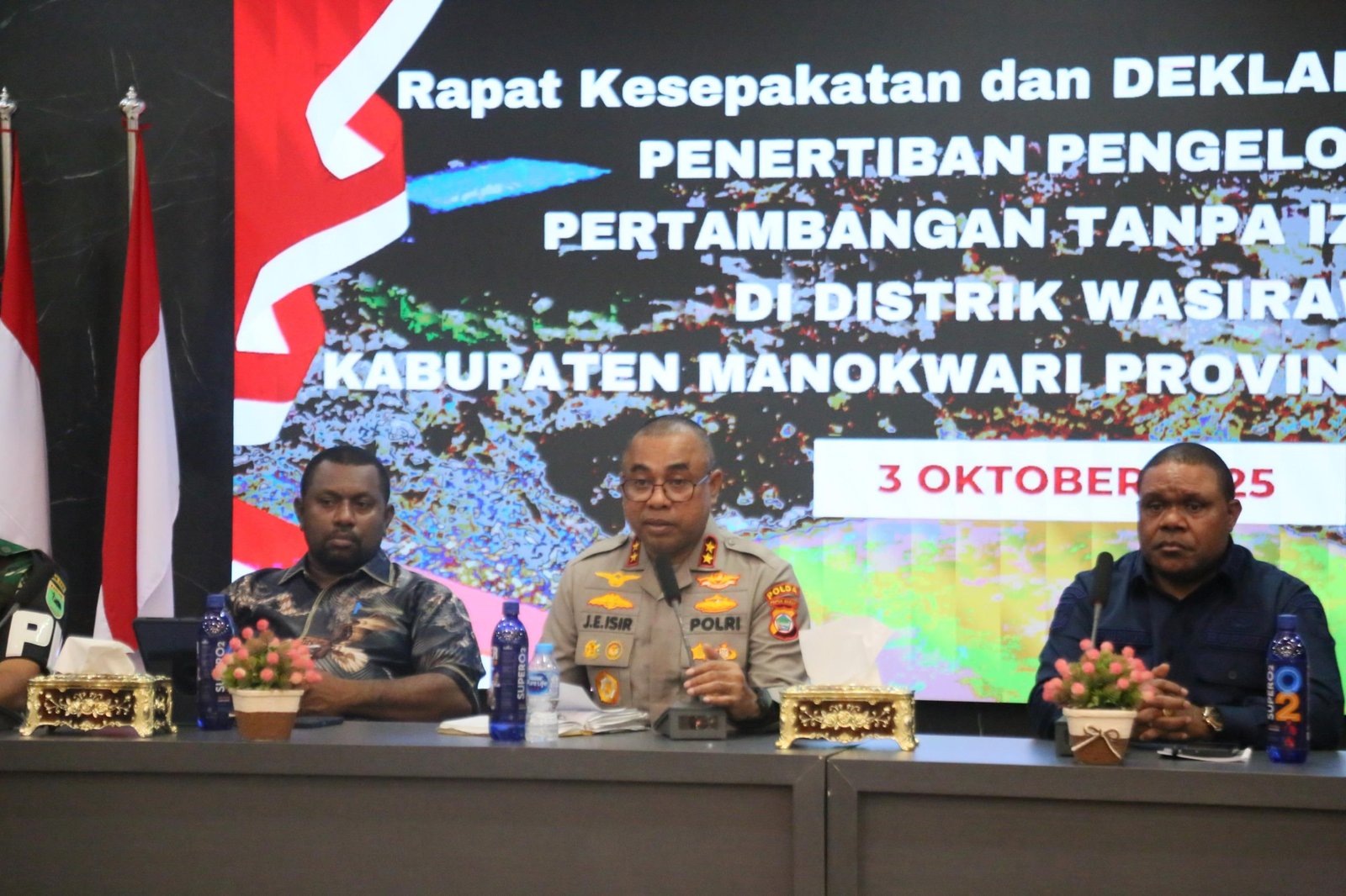 Papua Barat – Kepolisian Daerah Papua Barat menunjukkan keseriusan dalam menangani aktivitas Pertambangan Tanpa Izin (PETI) yang marak terjadi di Distrik Wasirawi, Kabupaten Manokwari. Langkah konkret itu diwujudkan melalui kehadiran Kapolda Papua Barat Irjen Pol Johnny Eddizon Isir, S.I.K., M.T.C.P., pada Rapat Kesepakatan dan Deklarasi Bersama Penertiban Pengelolaan Pertambangan Tanpa Izin (PETI) yang berlangsung di Aula Sasana Karya, Kantor Bupati Manokwari, Jumat (3/10/2025).