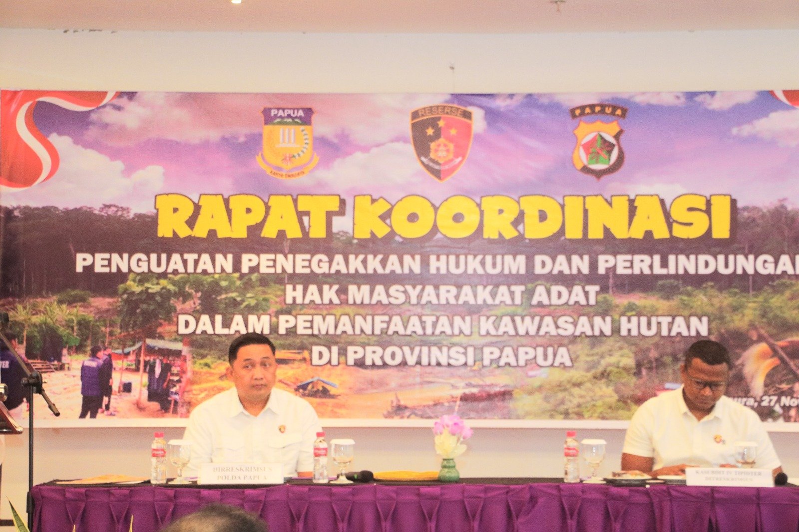 Papua – Direktorat Reserse Kriminal Khusus (Ditreskrimsus) Polda Papua menggelar Rapat Koordinasi (Rakor) strategis terkait Penguatan Penegakkan Hukum dan Perlindungan Hak Masyarakat Adat dalam Pemanfaatan Kawasan Hutan di Provinsi Papua yang berlangsung di Ballroom Hotel Fox Jayapura, Kamis (27/11/2025).