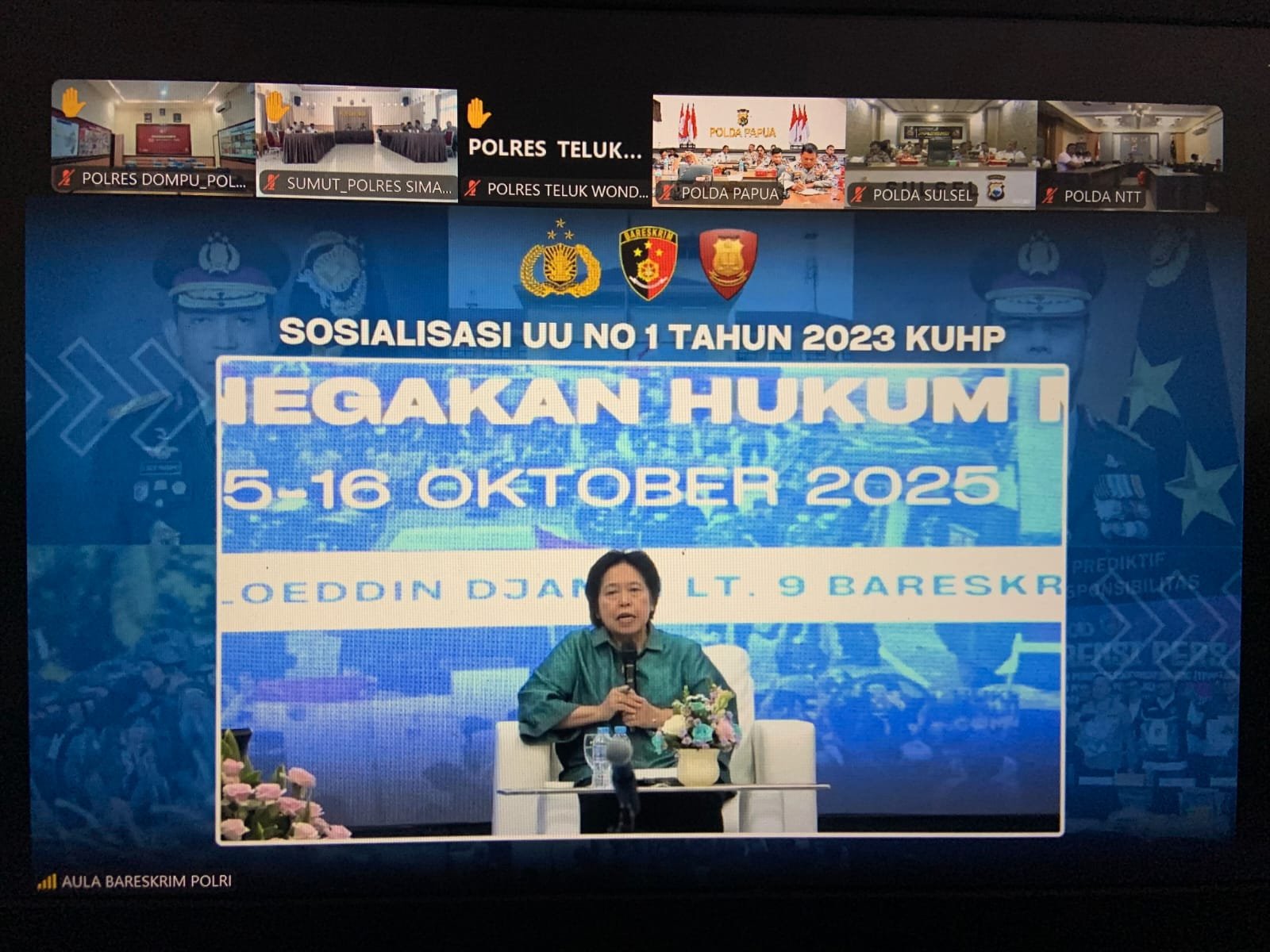 Papua – Kepolisian Daerah Papua mengikuti kegiatan Sosialisasi Undang-Undang Nomor 1 Tahun 2023 tentang Kitab Undang-Undang Hukum Pidana (KUHP) di lingkungan Polri yang dilaksanakan secara virtual melalui Zoom Meeting, Rabu (15/10). Kegiatan berlangsung di Aula Cenderawasih Mapolda Papua Lama dan diikuti oleh sejumlah pejabat serta personel dari berbagai satuan fungsi.