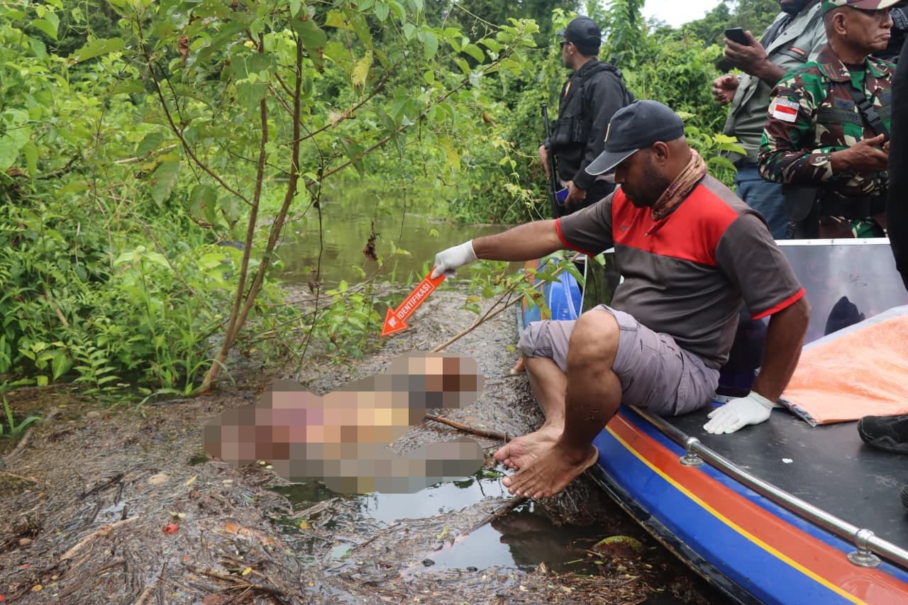 Papua – Kapolres Asmat AKBP Wahyu Basuki, S.I.K., memimpin langsung proses pencarian jenazah almarhum Indra Guru Wardana, korban penembakan oleh kelompok bersenjata di Kampung Ulakin, Distrik Kolof Braza, Kabupaten Asmat.