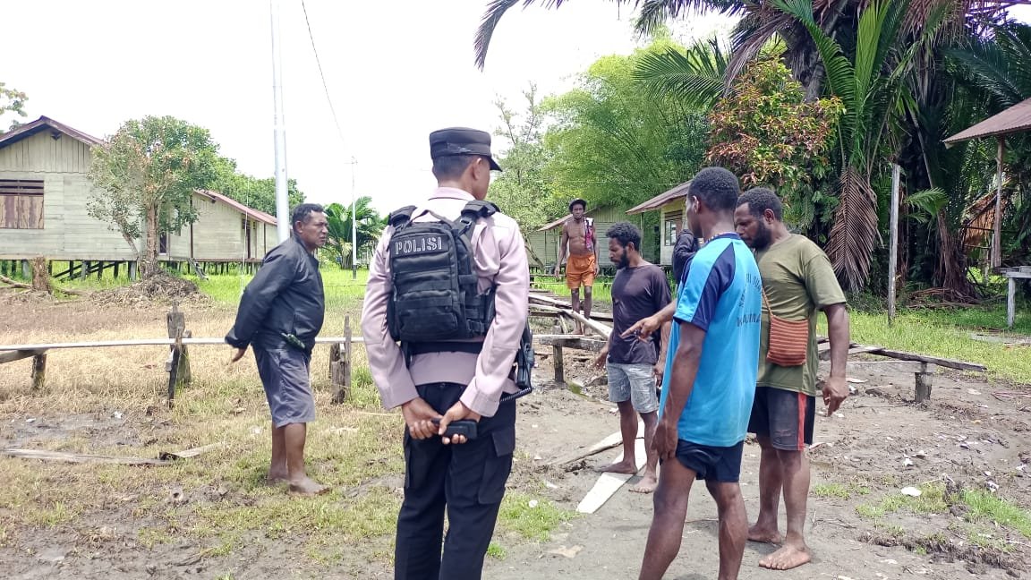 Papua – Personel Polres Asmat melaksanakan olah Tempat Kejadian Perkara (TKP) sekaligus upaya evakuasi jenazah korban penembakan atas nama Indra Guru Wardana di Kampung Ulakin, Distrik Kolf Braza, Kabupaten Asmat, pada Kamis (25/09).