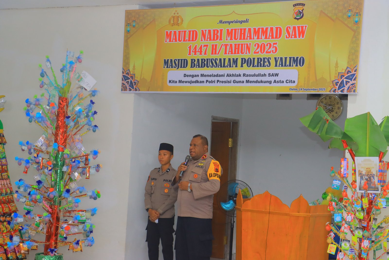 Papua – Polres Yalimo menyelenggarakan kegiatan Doa Bersama sekaligus Peringatan Maulid Nabi Muhammad SAW 1447 H / 2025 M yang berlangsung di Masjid Babussalam Polres Yalimo, Distrik Elelim, Kabupaten Yalimo, Provinsi Papua Pegunungan, Minggu (14/09).