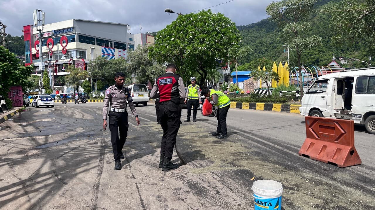 Respon Cepat Operasi Lilin Cartenz 2025, Polisi Amankan Jalan Sam Ratulangi dari Tumpahan Solar
