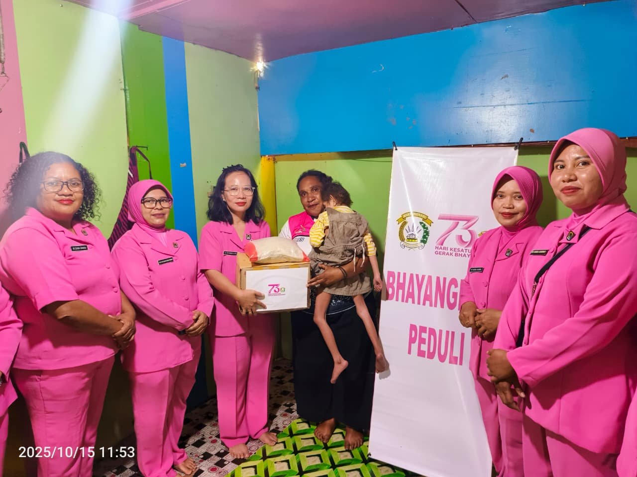 Papua – Dalam rangka menyambut Hari Kesatuan Gerak Bhayangkari (HKGB) ke-73, Ketua Bhayangkari Cabang Tolikara, Ny. Erni Roberth Hitipeuw, bersama pengurus menggelar kegiatan sosial bertajuk “Bhayangkari Peduli” dengan memberikan perhatian khusus kepada anak-anak penyandang disabilitas di wilayah Karubaga, Rabu (15/10/2025).