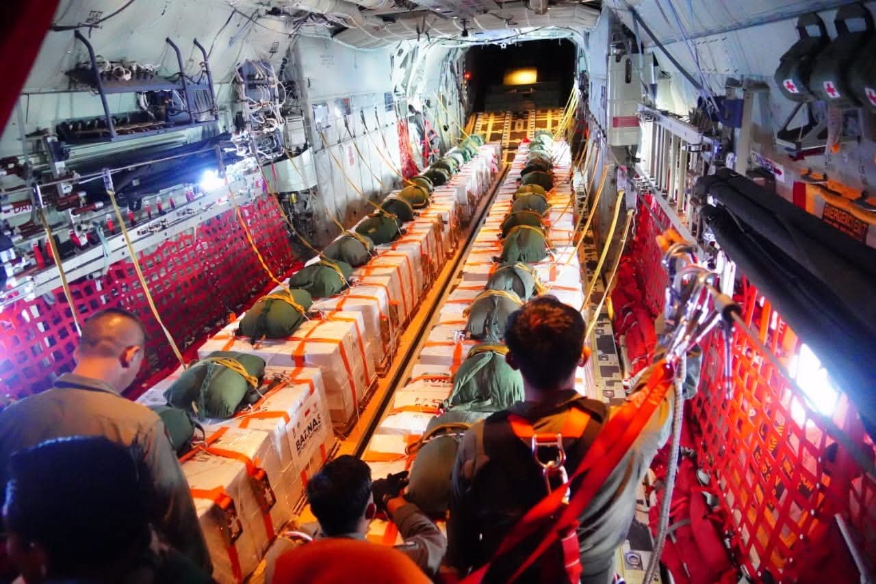 Di atas langit Gaza dua pesawat C-130 J Super Hercules A-1339 dan A-1344, menjatuhkan 68 bundel bantuan. Hari pertama menabur 17,8 ton, hari kedua 10,3 ton, diikuti hari ketiga dan keempat 22,4 ton bantuan, hingga hari kelima kembali menyalurkan 11,2 ton.