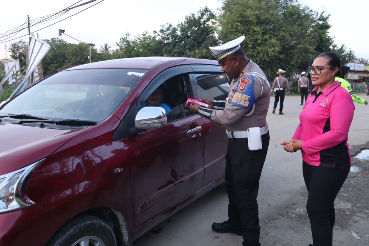 Kegiatan tersebut dipimpin langsung oleh Kasat Lantas Polres Sarmi IPTU Ferisano D. Worumi, S.H., bersama personel Sat Lantas serta melibatkan Bhayangkari Cabang Polres Sarmi. Suasana penuh kehangatan tampak saat personel kepolisian dan Bhayangkari menyapa para pengendara roda dua maupun roda empat yang melintas.