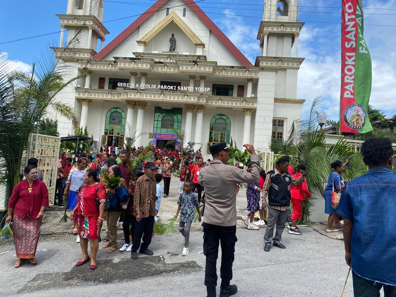 Fakfak, Papua Barat – Sinergitas TNI-Polri kembali terlihat dalam pengamanan ibadah Minggu Palem di Gereja Katolik Paroki St. Yosep, Kabupaten Fakfak, Minggu (29/3/2026). Kehadiran aparat gabungan tersebut memastikan seluruh rangkaian ibadah berlangsung aman, tertib, dan kondusif.