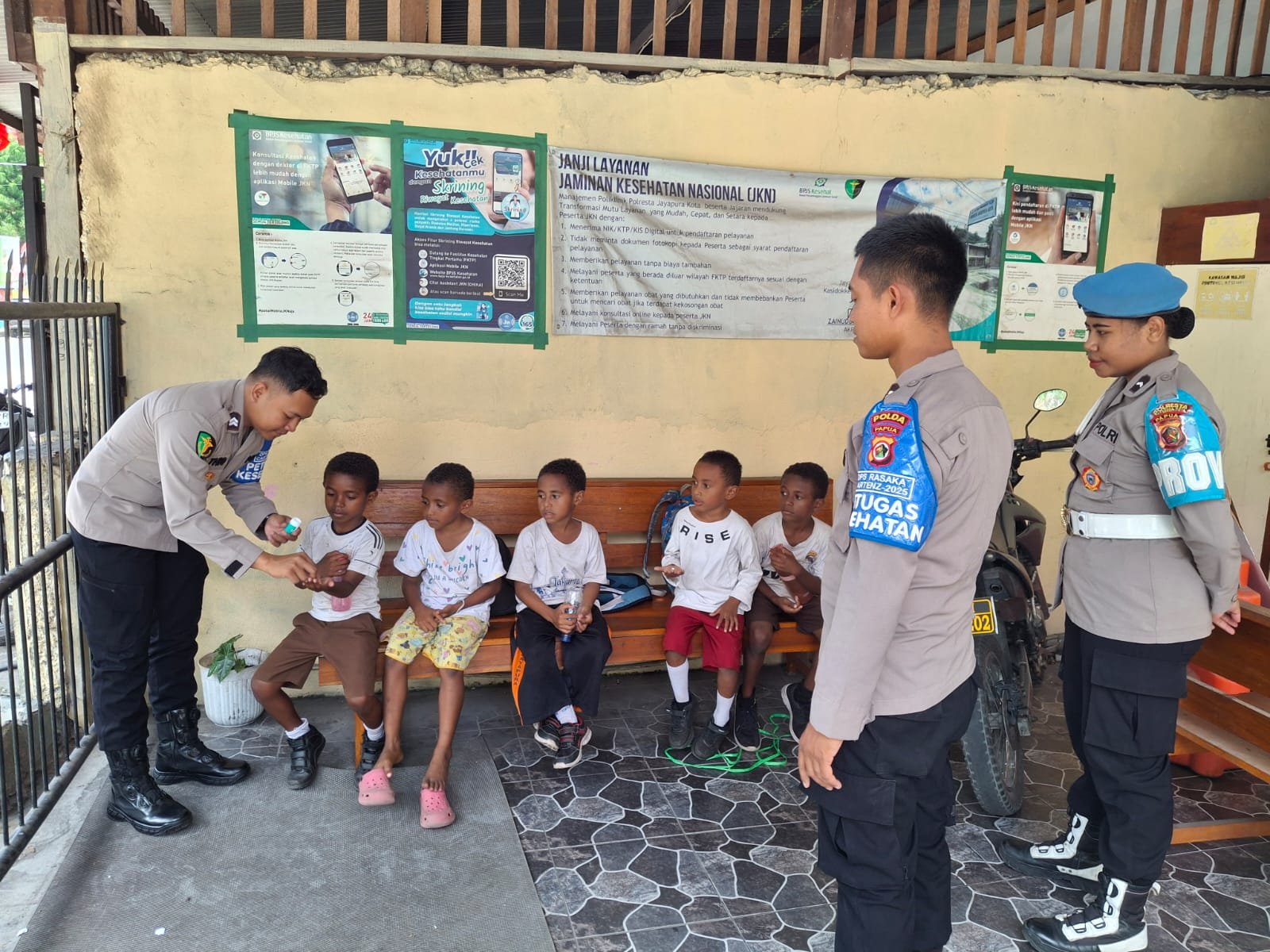 Dalam kesempatan tersebut, petugas Subsatgas Keladi Sagu, Briptu Aan dan Briptu Satrio, melayani anak-anak dengan penuh kepedulian, memberikan obat, vitamin, serta melakukan pemeriksaan kesehatan sederhana seperti pengukuran suhu tubuh dan tensi, sekaligus menyampaikan edukasi tentang pentingnya menjaga kebersihan diri serta pola hidup sehat sejak dini.
