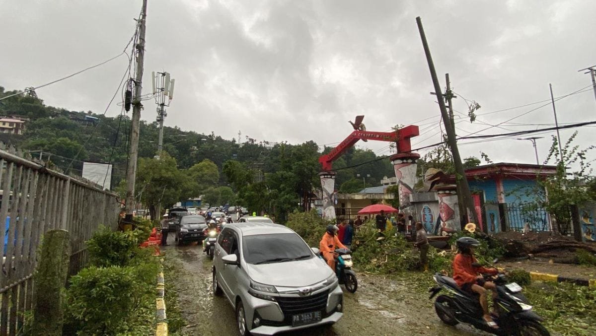 Papua – Tim SAR Direktorat Samapta Polda Papua melaksanakan aksi cepat tanggap dengan membersihkan pohon tumbang yang menghalangi jalan di depan Gedung Olahraga (GOR) Jayapura, usai hujan deras disertai angin kencang yang melanda wilayah tersebut, Selasa (28/10/2025).