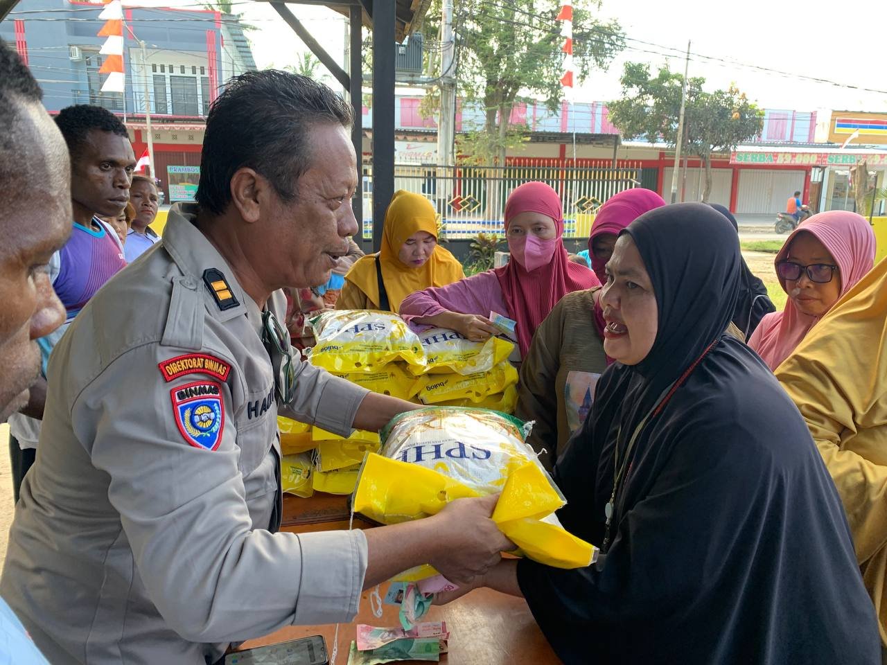 Sejak pagi, personel Dit Binmas telah menyiapkan 120 sak beras yang dijual dengan harga Rp65.000 per sak. Mekanisme penjualan dibatasi, satu KTP hanya dapat membeli maksimal dua sak beras untuk memastikan pemerataan.